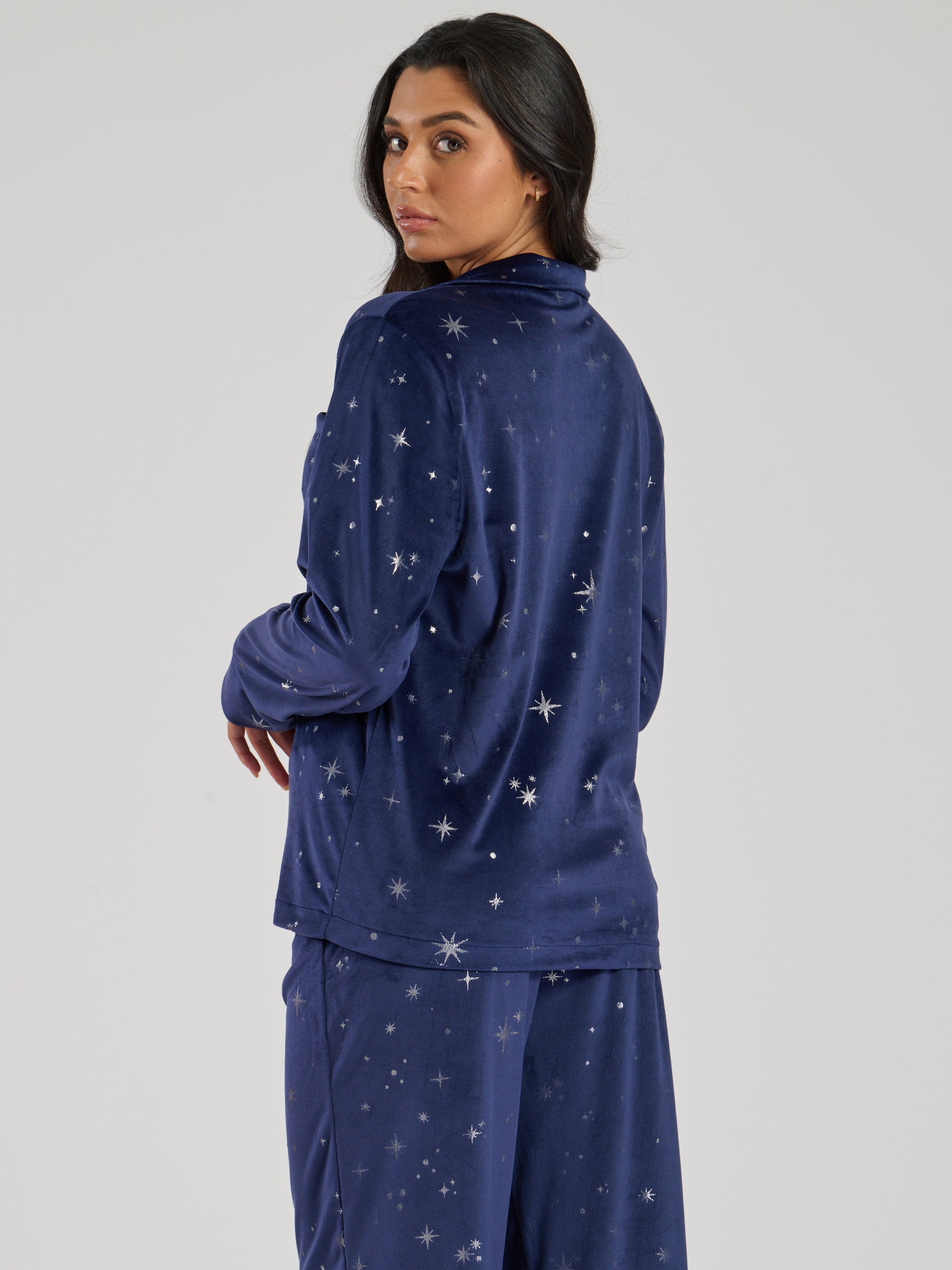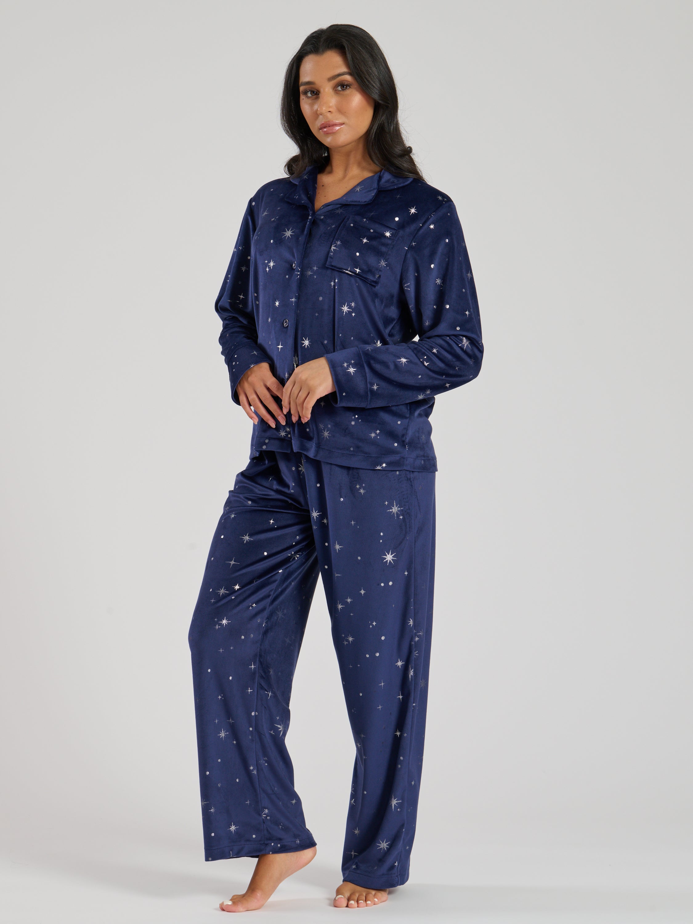This set combines the plush feel of velour with a touch of sparkle, offering a perfect blend of cosiness and glamour for your night-time routine.